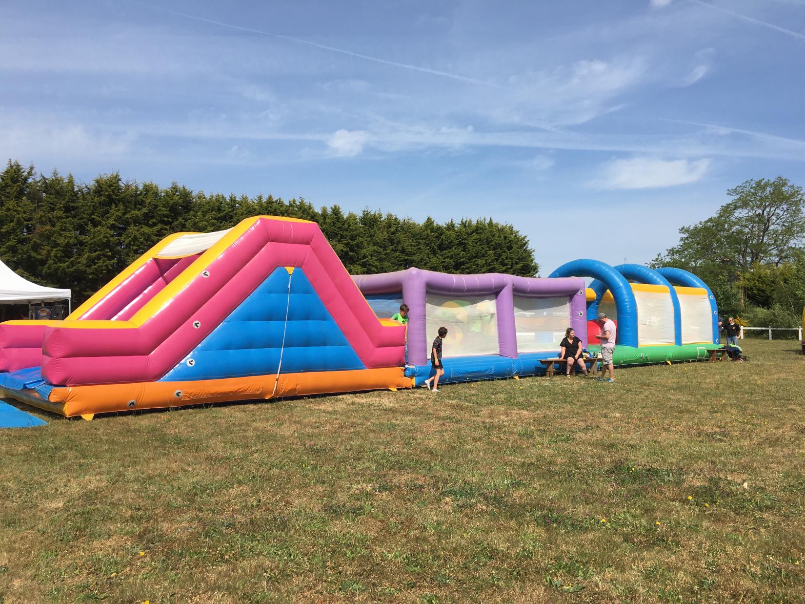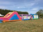 Grand parcours gonflable avec 2 ou 3 modules: un toboggan, 1 module avec 3 boules qu'il faut franchir sans tomber et pour terminer une grande zone de saut.